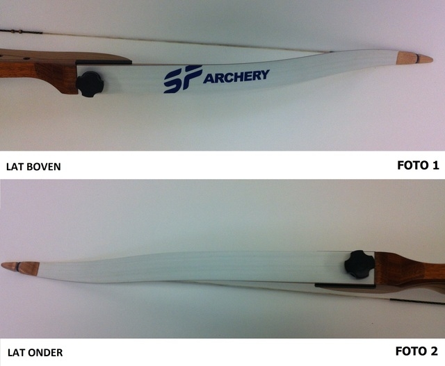 Op de lat boven het middenstuk hoort u aan de voorkant het merk SF Archery te zien, en op de lat onder van het middenstuk ziet u aan de binnenkant Optimo+.