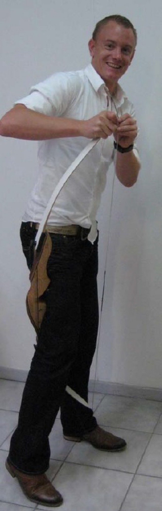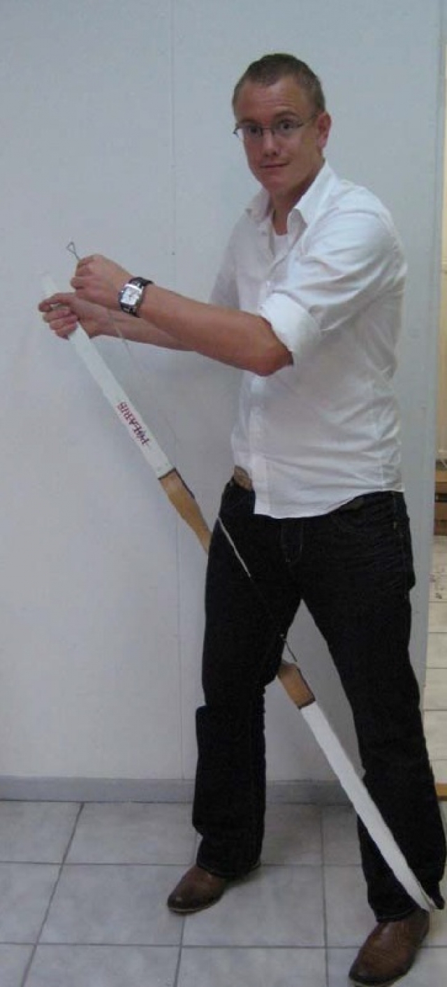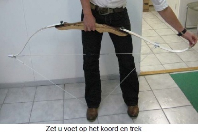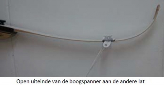 Let op! Wanneer u de handboog op deze manier op spanning brengt, kan er torsie op de latten ontstaan. Hierdoor kan een lat iets krom trekken. De beste manier is om de handboog met een boogspanner op spanning te brengen.