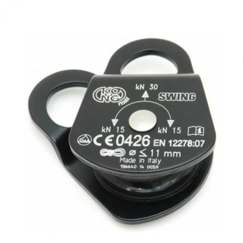 De Kong Swing Alu is een vrij eenvoudige kleine aluminium katrol voorzien van mobiele (beweegbare) flanken en een kunststof wiel.